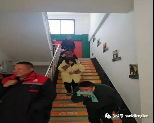 疏散逃生應(yīng)急演練環(huán)節(jié),全體參培人員進(jìn)行了消防疏散逃生演練,使用濕毛巾捂住口鼻有序快速?gòu)娜龢桥嘤?xùn)室沿梯步?jīng)_向園區(qū)院壩。